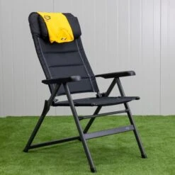 De stoel is gemaakt van lichtgewicht aluminium en een solide polyester bekleding, waardoor de stoel een gewicht van 110 kg aan kan. De stoelpoten zijn voorzien extra stabilisatoren en een safety-lock die ongewenst inklappen tegengaat. Het grote zitoppervlak en de lange rugleuning zorgt ervoor dat de stoel lekker zit.